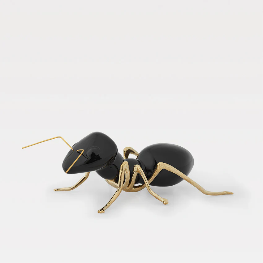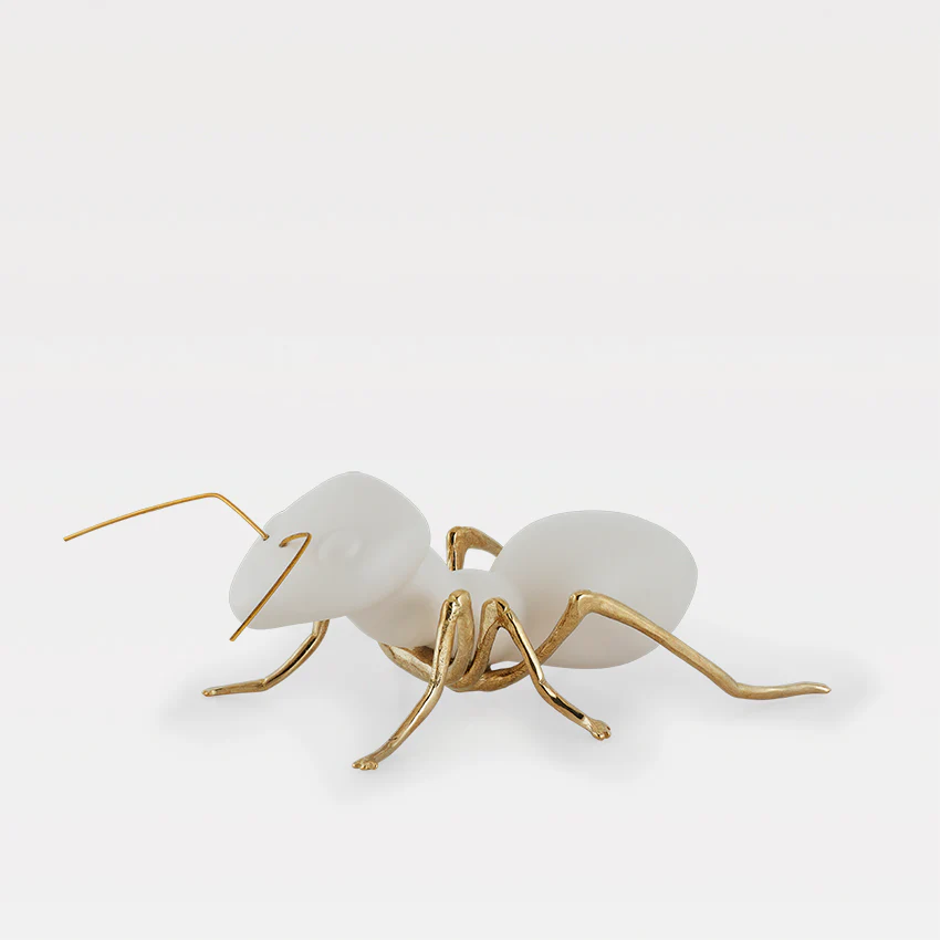 “A Formiga em construção” é uma representação de uma observação própria, em faiança, vidrada segundo a tradicional técnica manual de imersão. Esta peça, puramente decorativa, é enobrecida por um corpo em latão natural ou oxidado, fundido manualmente em molde de areia. A combinação única destes dois materiais, recria um símbolo do equilíbrio e da elegância. As peças são feitas à mão, podendo apresentar pequenas variações.